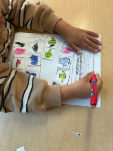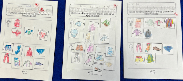 Plusieurs enfants ont fait beaucoup d’efforts, cependant plusieurs ne parlent pas, malgré mes encouragements. Je vous invite à revoir avec eux les habits ainsi que les parties du corps. Nous verrons les parties du corps dans les prochaines semaines.Atelier découpage des vêtements