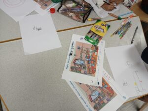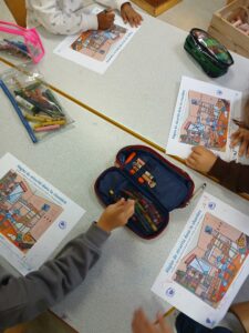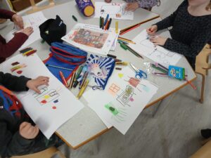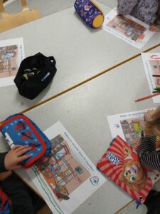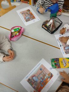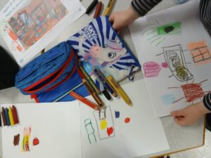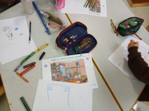Tout d’abord nous avons préparé notre matériel en choisissant les crayons de couleur nécessaires pour notre dessin: