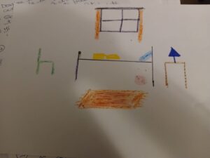Nous avons vu la lettre C aujourd’hui, certains enfants se sont portés volontaires pour mimer un mot commençant par cette lettre. Nous avons eu le mot : crocodile, coq, chat (bien que le son ici soit CH, et kangourou, qui commence par K comme Karine et non C).