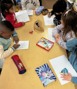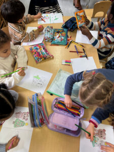 Après nos rituels habituels : l’appel, la date et la visite de la bibliothèque, nous avons parlé de notre projet de solidarité – décoration d’une carte de Noël pour un résident d’un Ehpad (Établissement d’hébergement pour personnes âgées dépendantes).
