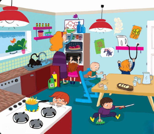 Les enfants ont identifié les dangers comme : les brulures, les coupures, les objets posés au bord de la table et qui peuvent tomber, les produits incomestibles qui devraient être hors de portée des enfants et comment les prévenir.